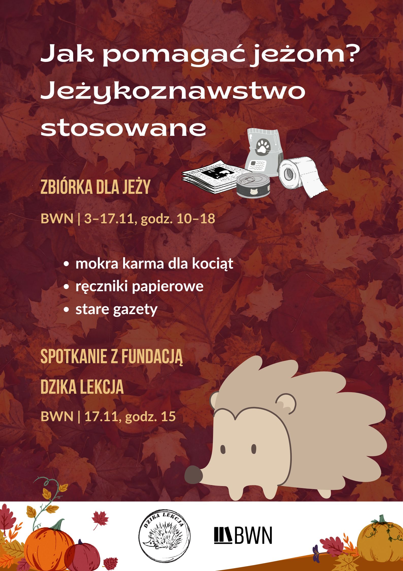 Na zakończenie zbiórki – w poniedziałek 17 listopada – zapraszamy na spotkanie z Dziką Lekcją, podczas którego dowiecie się, jak pomóc przetrwać jeżom. Spotkanie zacznie się o godz. 15.00 w Czytelni BWN.
